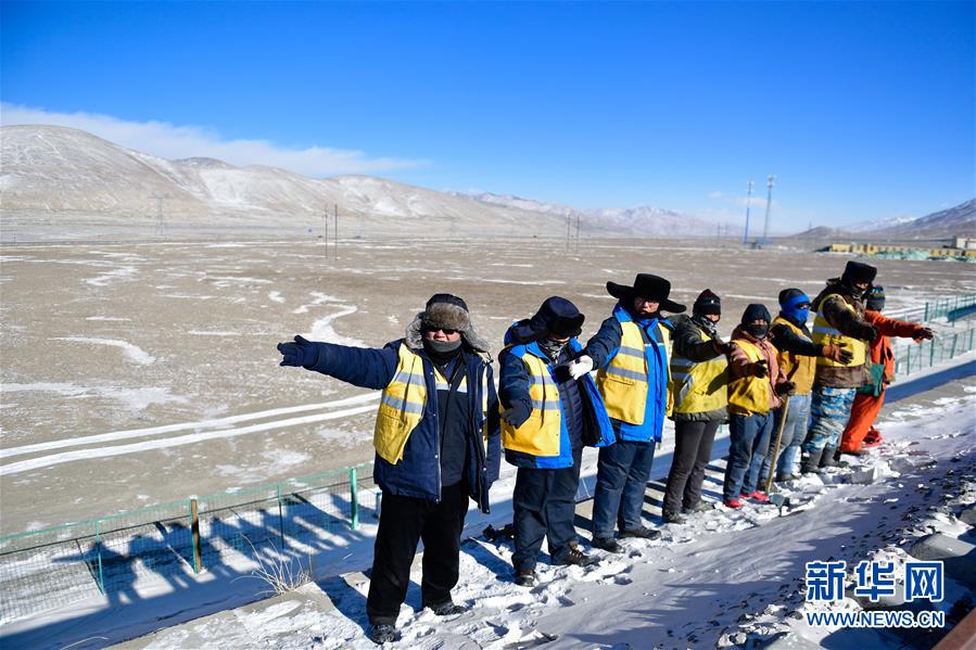 1月12日清晨,于本蕃(中)與工友在昆侖山口附近的青藏鐵路上施工。新華社記者 張龍 攝
