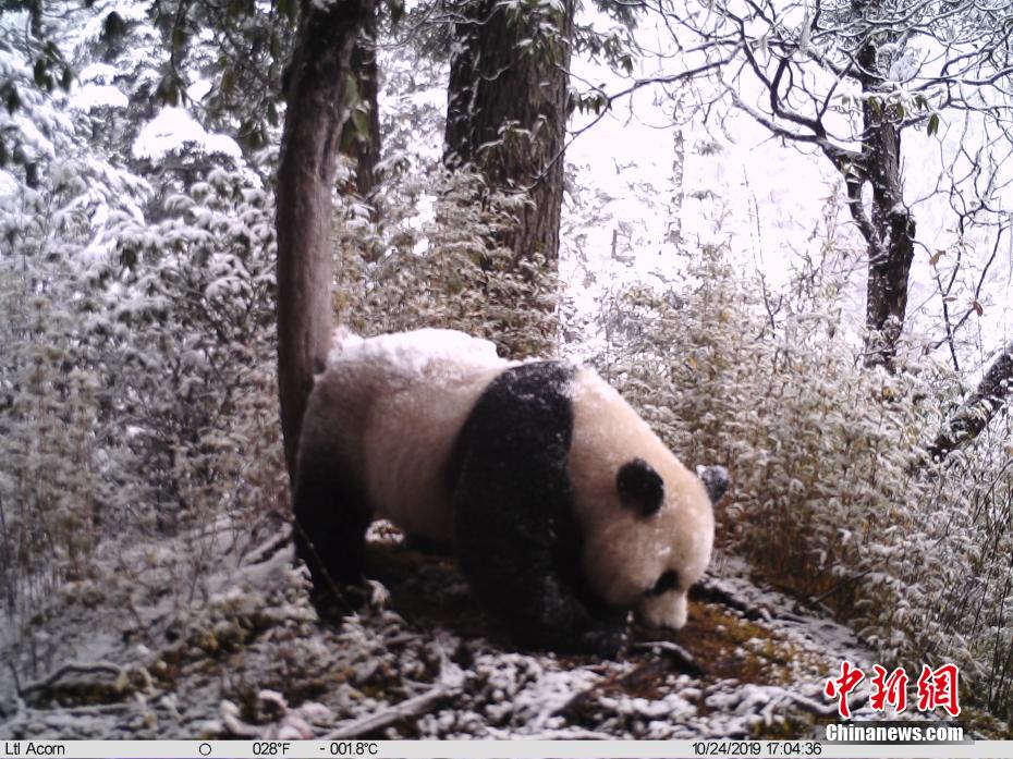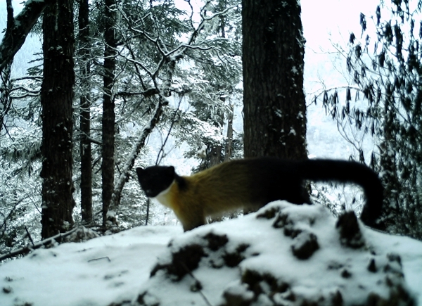 此次拍攝到的視頻資料顯示,在保護(hù)區(qū)多個點(diǎn)位都有大熊貓活動的身影,并且出現(xiàn)了多次,其中在同一區(qū)域,兩次拍到大熊貓嗅味樹標(biāo)記行為;在同一點(diǎn)位同時拍攝到大熊貓、川金絲猴、金貓、黃喉貂、黑熊、毛冠鹿、野豬、豪豬等8種動物活動影像。此外,保護(hù)區(qū)還首次拍攝到金貓活動影像。