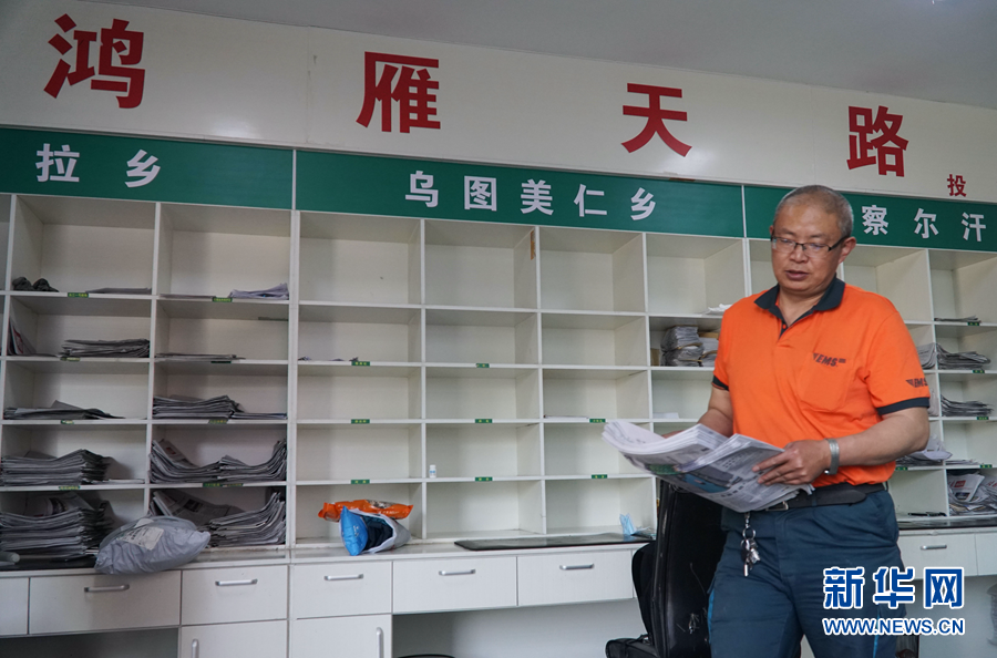 6月29日,中國(guó)郵政集團(tuán)有限公司格爾木市分公司的郵件分揀大院里,葛軍在整理報(bào)紙。新華社記者 耿輝凰 攝
