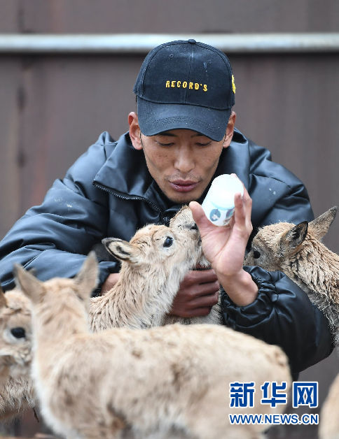 7月8日,三江源國家公園管理局長江源園區(qū)可可西里管理處卓乃湖保護站的工作人員才文多杰在給藏羚羊幼仔喂奶。新華社記者 張龍 攝