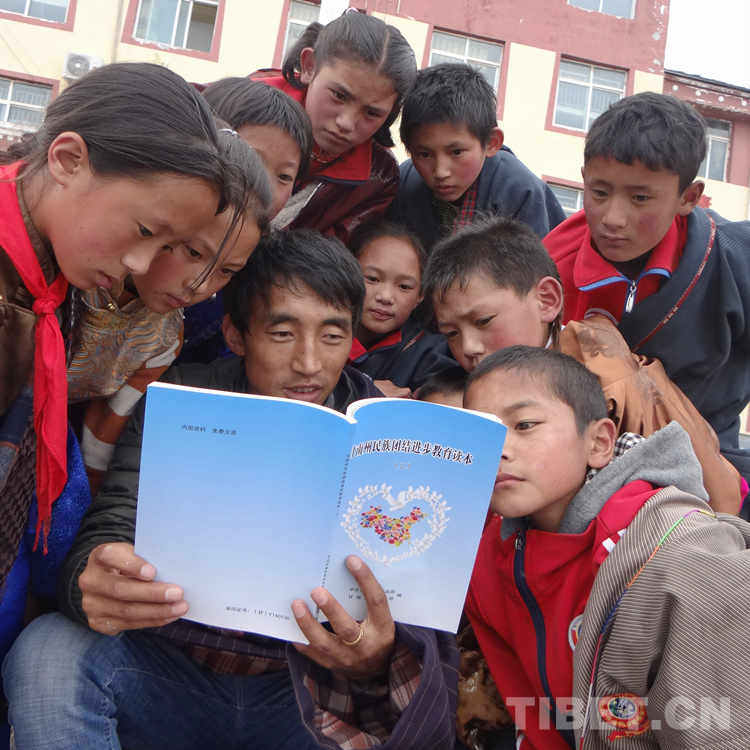 圖為甘南州瑪曲縣齊哈瑪鄉(xiāng)寄宿制學(xué)校的師生在學(xué)習(xí)《甘南州民族團結(jié)進步教育讀本》