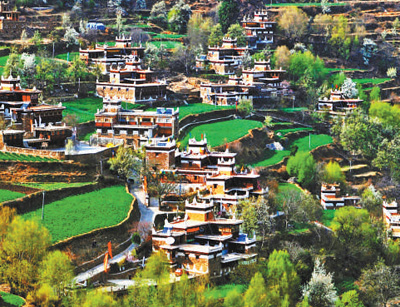 相對高差近千米的山坡上,一幢幢藏式樓房分布在綠樹叢中,陽光從云的縫隙間投射在山坡上,錯落有致,恬靜安寧。