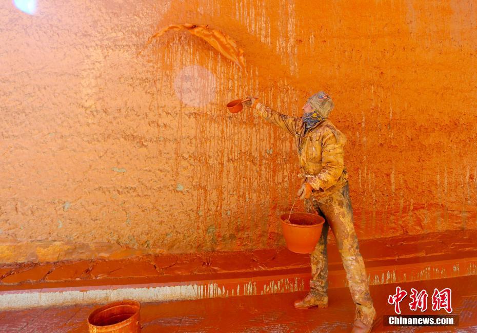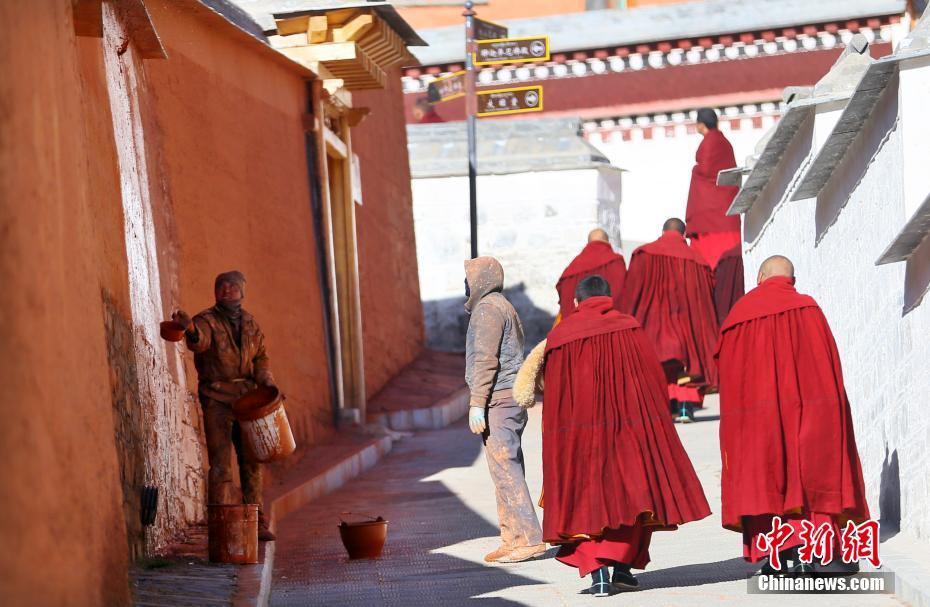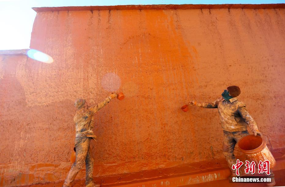 11月9日,甘肅夏河縣拉卜楞寺內(nèi),匠人用傳統(tǒng)潑灑方法為寺院墻壁“美顏”。中新社記者 高展 攝