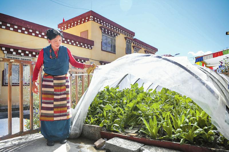 10月12日,甘孜縣吉絨隆溝集中安置點(diǎn)村民展示自己種植的蔬菜。四川日?qǐng)?bào) 楊樹(shù) 攝