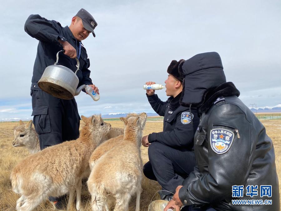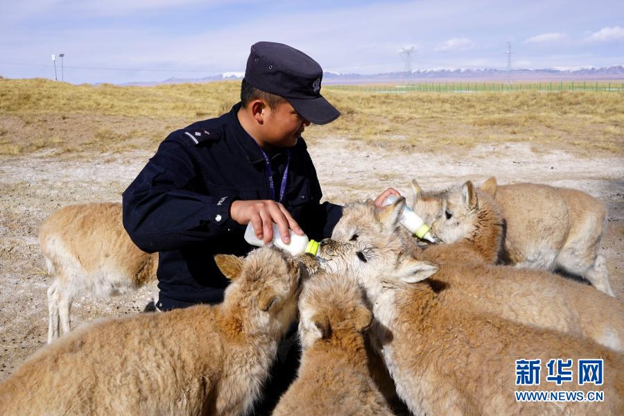 12月7日,可可西里巡山隊(duì)員達(dá)才在給藏羚羊幼仔喂奶。新華社記者 藍(lán)翔 攝