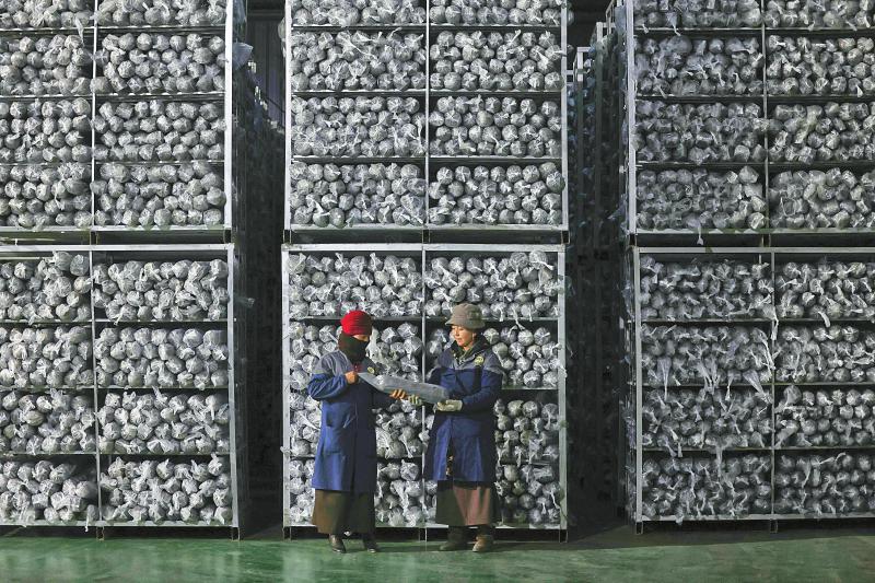 1月4日,松茸產(chǎn)業(yè)園的管理人員在倉庫里整理即將發(fā)放給當(dāng)?shù)胤N植戶的滑子菇菌包。尹鋼 攝
