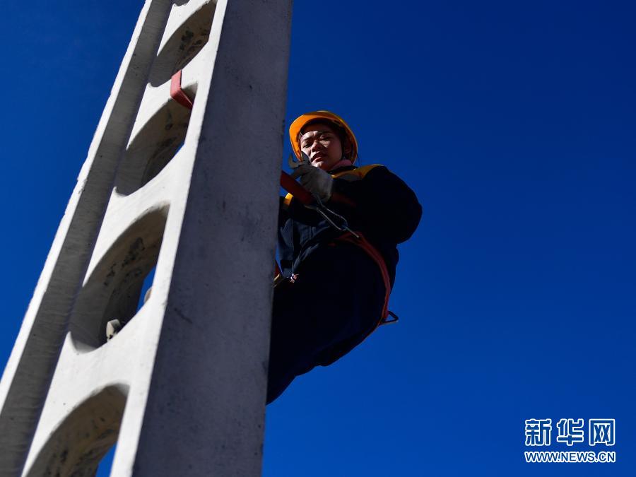 2月2日,在青藏鐵路公司西寧供電段哈爾蓋工區(qū)負(fù)責(zé)鐵路線(xiàn)上,羅露露在攀登接觸網(wǎng)支柱。新華社記者 張龍 攝