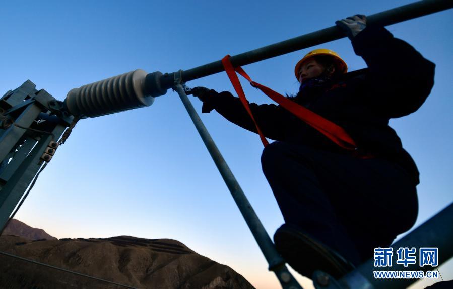2月2日,在青藏鐵路公司西寧供電段哈爾蓋工區(qū)負(fù)責(zé)鐵路線(xiàn)上,羅露露在檢修螺絲。新華社記者 張龍 攝