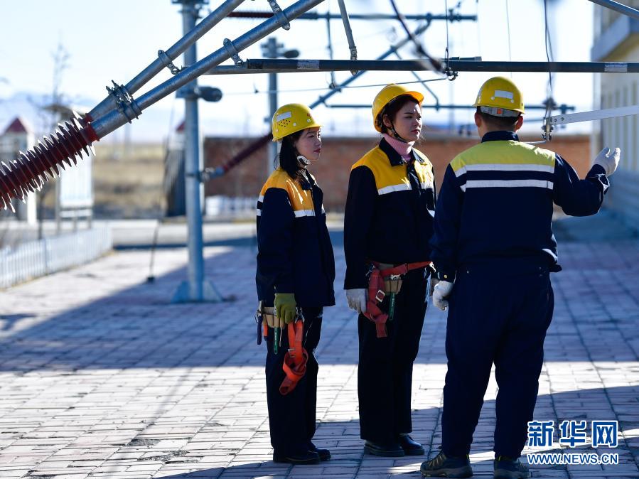 2月2日,在青藏鐵路公司西寧供電段哈爾蓋工區(qū),郭勝?gòu)?qiáng)(左)與羅露露(中)在聽(tīng)老職工講解安全知識(shí)?!⌒氯A社記者 張龍 攝
