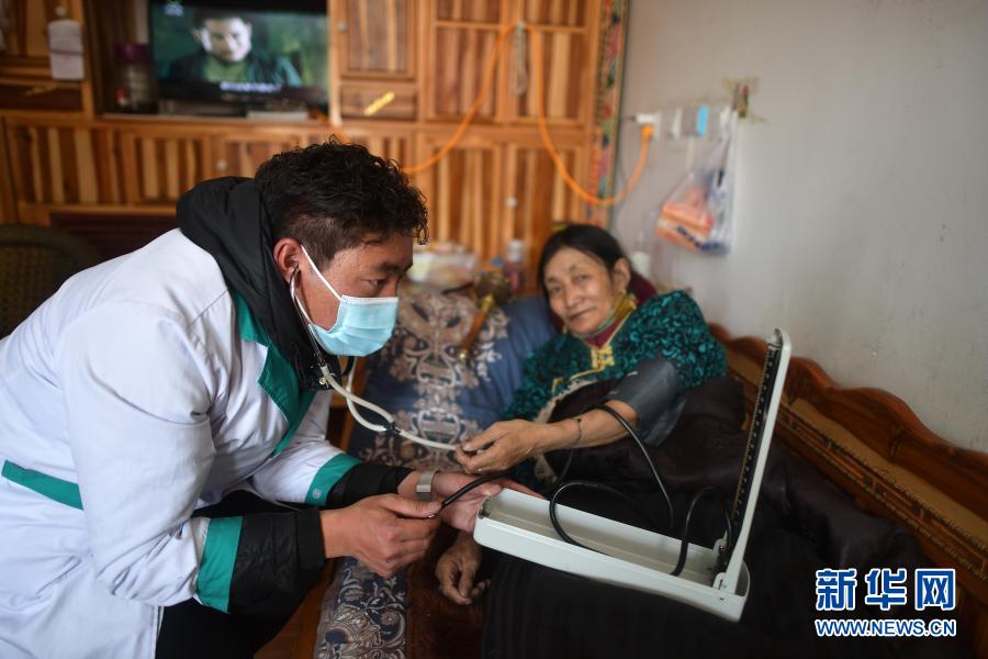 3月14日,幸福敬老院醫(yī)務(wù)室醫(yī)生土丁西周(左)為老人測量血壓。新華社記者 張宏祥 攝