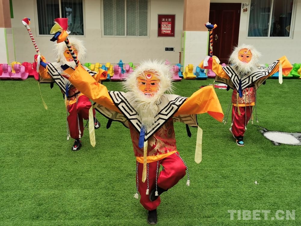 圖為高城鎮(zhèn)幼兒園的孩子們體驗藏戲游戲
