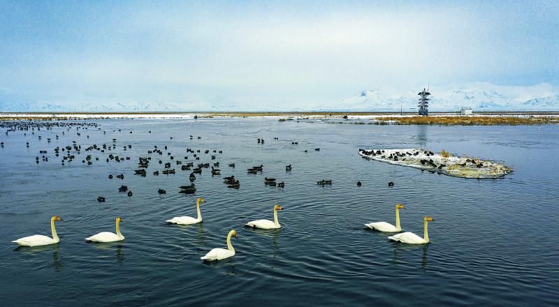3月6日,若爾蓋濕地國家級自然保護區(qū)在花湖設立的高科技無人觀測塔(右后)正全天候觀察濕地鳥類的活動。尹鋼 攝