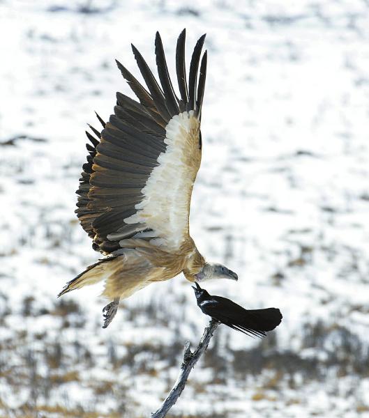 3月9日,在麥溪鄉(xiāng)濕地,一只草原烏鴉和一只高山兀鷲爭斗。尹鋼 攝