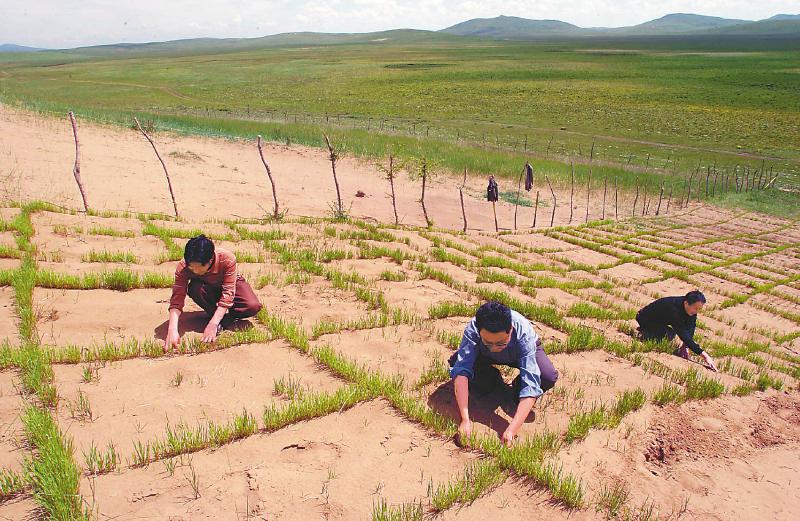 2007年4月8日,當地群眾在若爾蓋縣麥溪鄉(xiāng)和轄曼鎮(zhèn)實施防沙治沙項目。尹鋼 攝