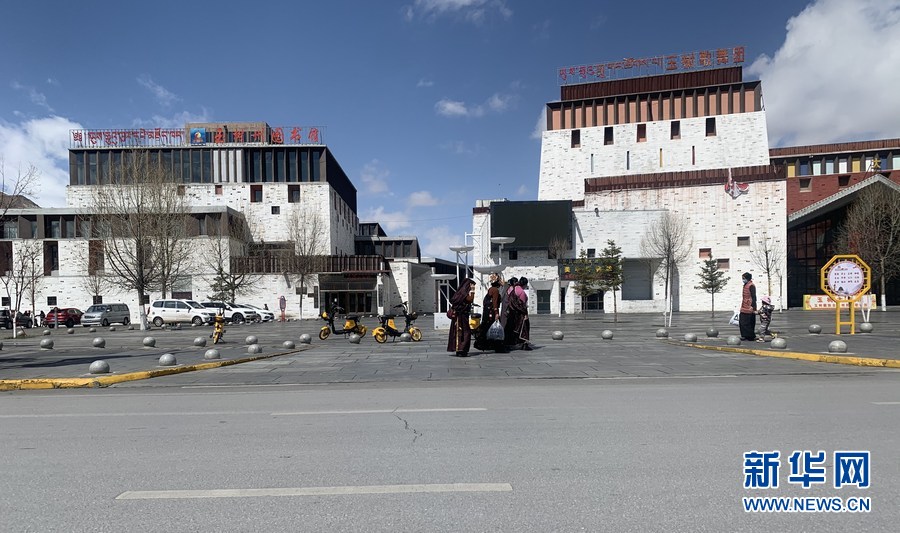 圖為位于玉樹市中心的玉樹州圖書館和玉樹歌舞團(tuán)。(2021年4月14日攝)新華社記者 李琳海 攝