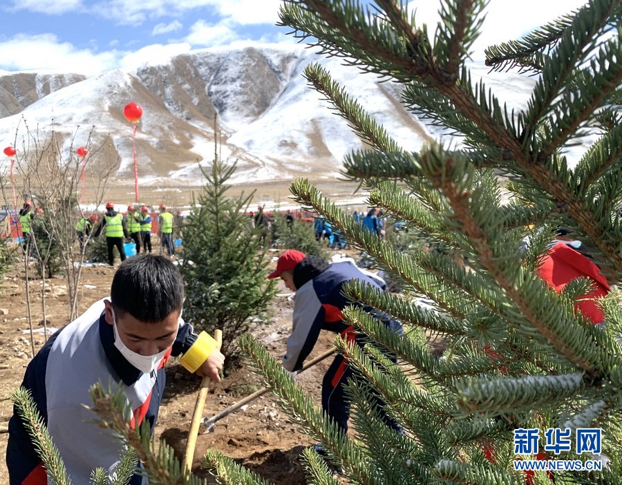 4月14日當(dāng)天,玉樹舉行植樹活動(dòng)。圖為當(dāng)?shù)貙W(xué)生在距離玉樹市區(qū)約7公里的山坡植樹。新華社記者 李琳海 攝