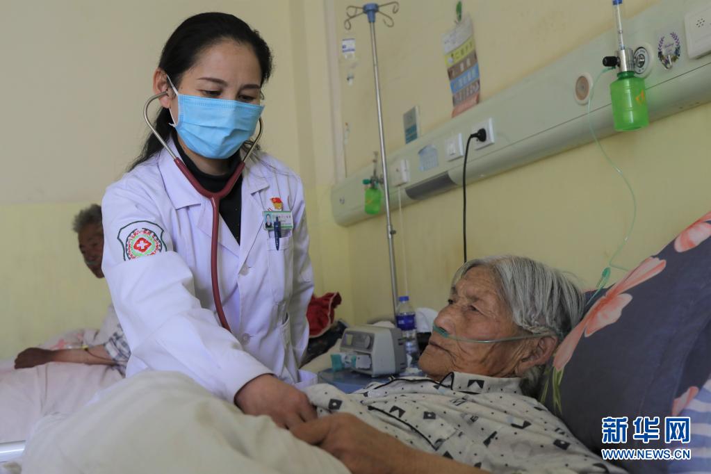 青海省玉樹藏族自治州玉樹市八一醫(yī)院內(nèi)科醫(yī)生尼樣卓瑪在為患者查體(4月12日攝)。新華社記者 趙玉和 攝