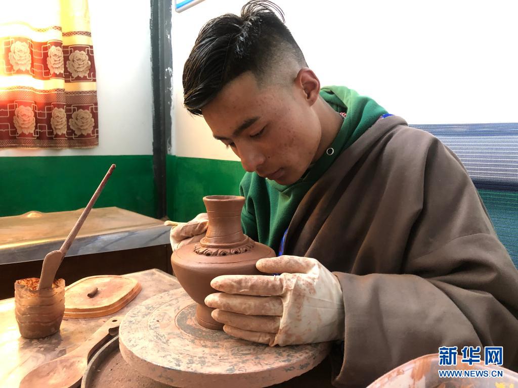 青海省玉樹藏族自治州囊謙縣吉曲鄉(xiāng)山榮村村民在扶貧產(chǎn)業(yè)園內(nèi)制作黑陶(2020年7月4日攝)。新華社記者 李占軼 攝