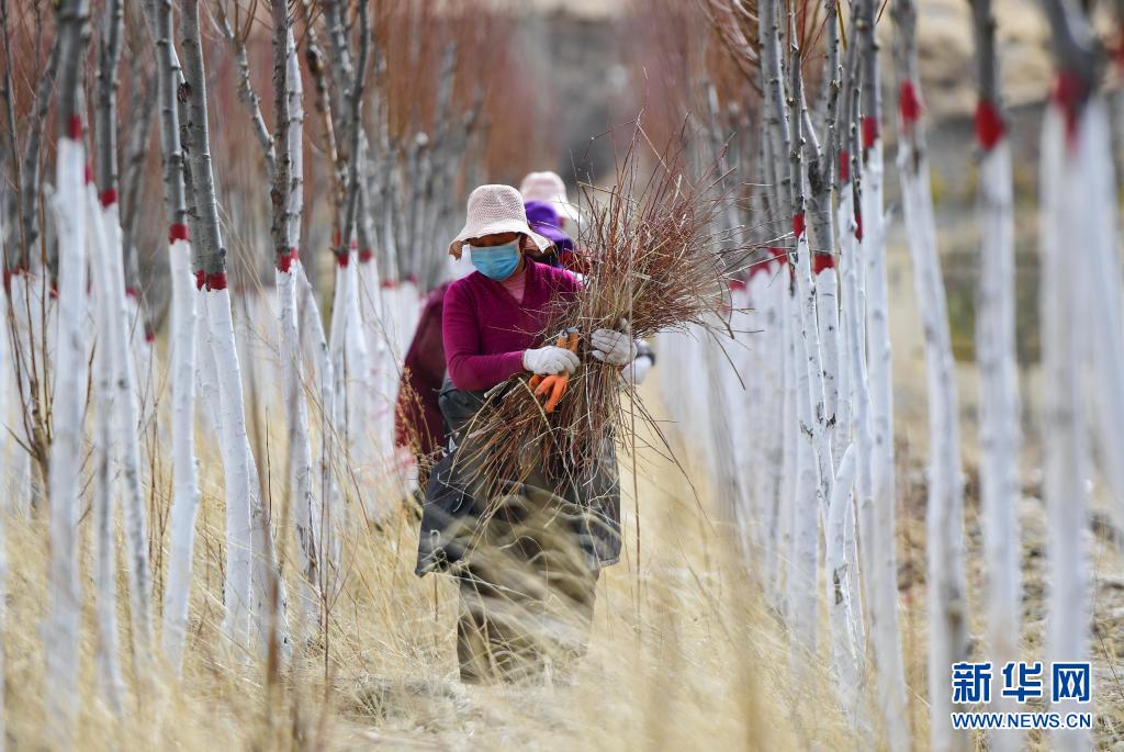 在青海省玉樹藏族自治州高原千畝林木良種繁育實(shí)驗(yàn)基地,當(dāng)?shù)厝罕娫谇謇硇藜暨^的樹枝(2020年3月29日攝)。新華社記者 張龍 攝