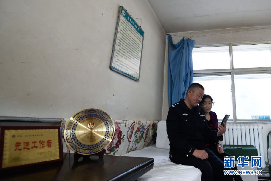 4月15日,在寺溝景區(qū)警務室,趙延壽與妻子田玉秀與兒子視頻聊天。新華社記者 張龍 攝