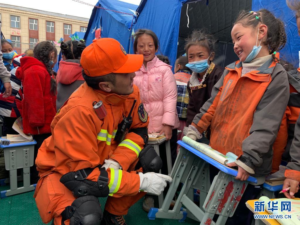 5月25日,青海省玉樹(shù)藏族自治州消防救援支隊(duì)消防員群英尕?。ㄗ螅┰诂敹嗫h民族寄宿制中學(xué)的安置區(qū)與學(xué)生交談。 新華社記者 解統(tǒng)強(qiáng) 攝