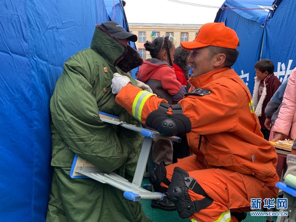 22日,地震發(fā)生后,群英尕丁來(lái)到安置區(qū)搭建帳篷和消防排查,12歲的班瑪華桑就與身穿橙色制服的群英尕丁結(jié)下了兄弟情誼?!拔覀兪且惠呑拥男值?,這幾天你也要照顧好自己?!比河㈡囟⌒χ鴩诟腊喱斎A桑。