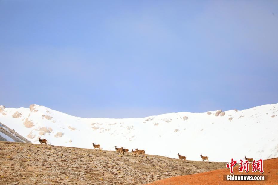 近日,甘肅張掖市祁連山國家公園內(nèi)野生動物“組團”出沒的難得一見畫面。郎文瑞 攝