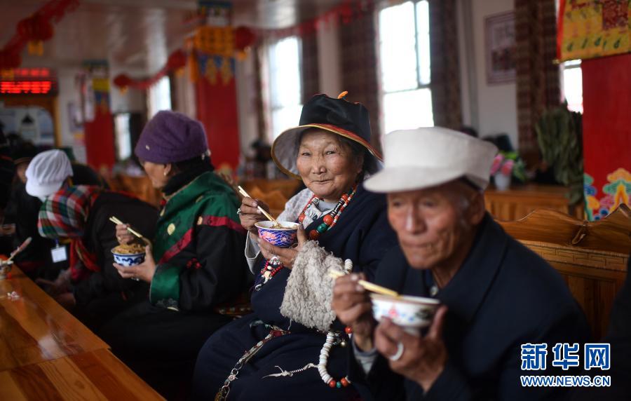 圖為治多縣幸福敬老院內(nèi),老人們在餐廳吃早餐。胡貴龍 攝