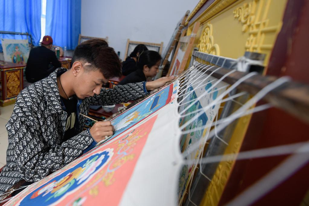 唐卡是藏族文化中獨(dú)具特色的繪畫藝術(shù)形式,具有鮮明的民族特點(diǎn),被稱為藏族的“百科全書”,也是中華民族彌足珍貴的非物質(zhì)文化遺產(chǎn)。2001年,青海民族大學(xué)藝術(shù)學(xué)院創(chuàng)辦全國首個(gè)工藝美術(shù)(唐卡)專業(yè),將傳統(tǒng)民間藝術(shù)納入大學(xué)教學(xué)體系,實(shí)現(xiàn)從民間師徒傳承模式向?qū)W校教學(xué)模式的轉(zhuǎn)變,為傳統(tǒng)民族文化培養(yǎng)人才,更好地傳承非遺文化。