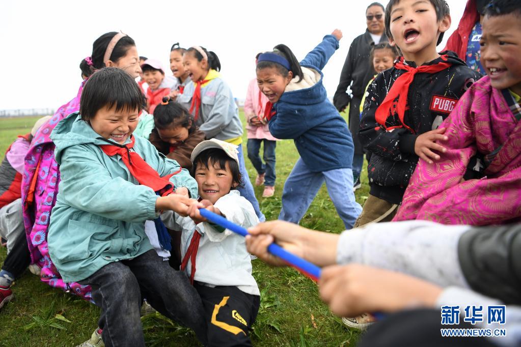 7月14日,河曲馬場小學老師道布旦(中)在草原上組織孩子們拔河。新華社記者 陳斌 攝