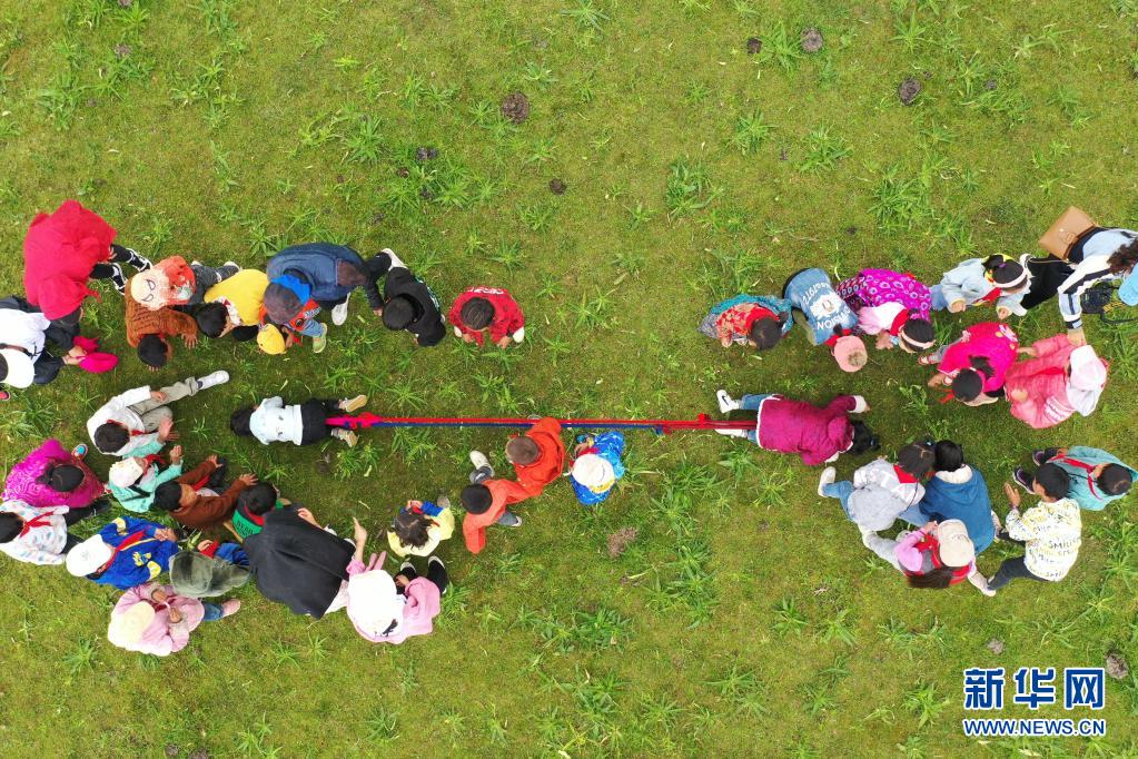 7月14日,河曲馬場小學的孩子們在草原上進行拔河比賽(無人機照片)。新華社記者 杜哲宇 攝
