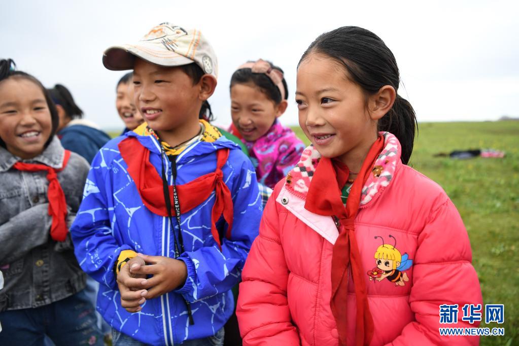 7月14日,河曲馬場小學的孩子在草原上唱歌。新華社記者 杜哲宇 攝