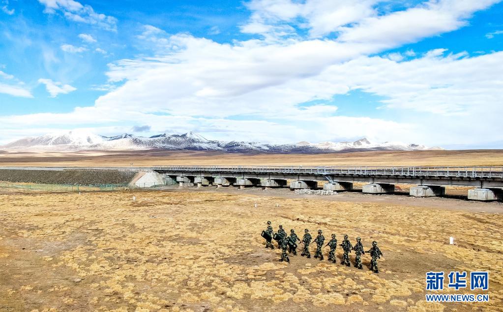 武警青??傟爤?zhí)勤支隊執(zhí)勤七中隊官兵在青藏鐵路沿線巡邏(5月21日攝)。新華社 楊浩 攝