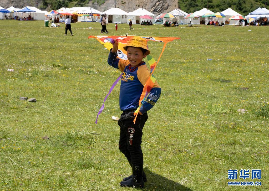 7月22日,小朋友在道孚縣玉科草原上放風(fēng)箏。新華社記者 劉夢琪 攝