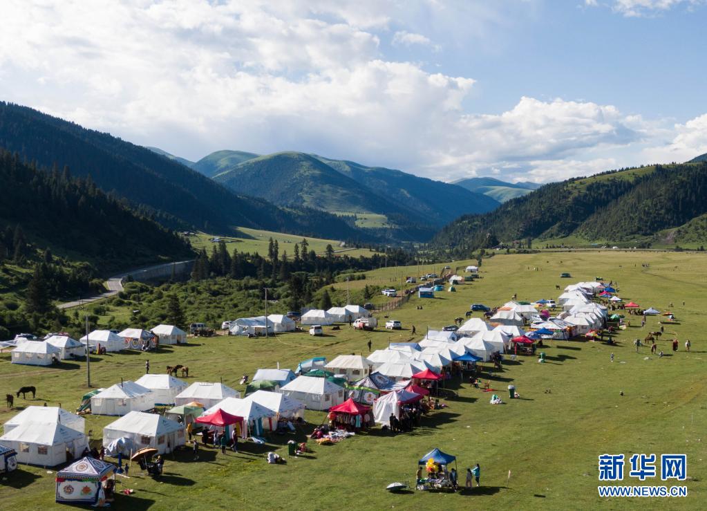 7月22日,人們在道孚縣玉科草原上搭起帳篷休閑(無人機(jī)照片)。新華社記者 江宏景 攝