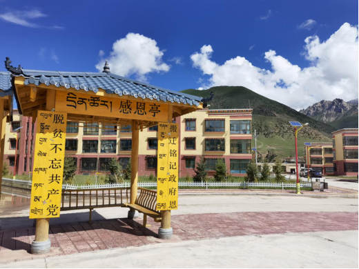 群山連綿、江河蜿蜒,雜花生樹(shù)、綠草如茵,距離縣城3公里,“牧人希望家園”靜靜矗立在瀾滄江源頭。走進(jìn)大門,小區(qū)內(nèi)寬敞的廣場(chǎng),配套設(shè)施齊全,刻著“感恩”紅色大字的石頭擺放在中央,還專門設(shè)有“感恩亭”,老人孩童,坐在一排排白墻紅瓦藏式風(fēng)格濃郁的三層小樓臺(tái)階上納涼,一派歡樂(lè)祥和景象。這里是海拔4200米青海玉樹(shù)藏族自治州雜多縣的一個(gè)易地扶貧搬遷安置點(diǎn)。我們今天走訪的對(duì)象是蘇魯鄉(xiāng)山榮村的東尕和巴宗。