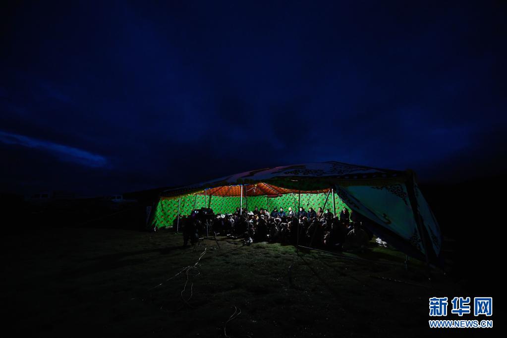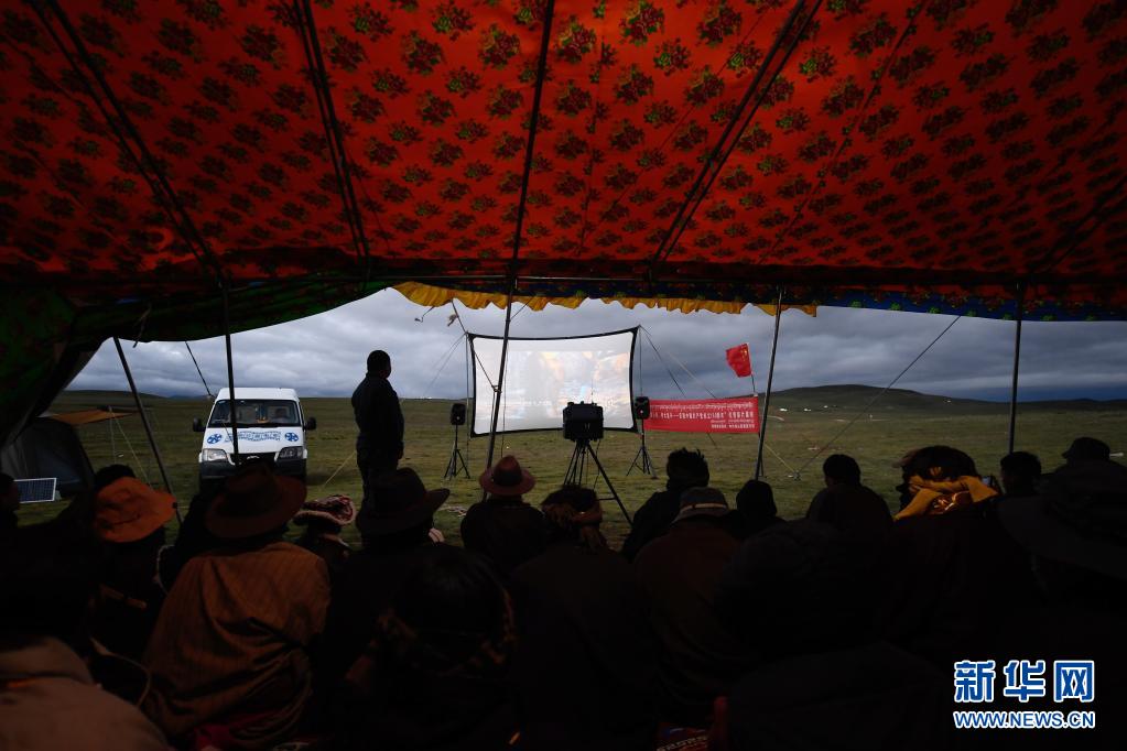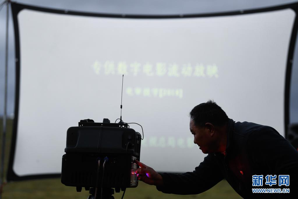 8月3日,在瑪沁縣當(dāng)洛鄉(xiāng)貢龍村的夏季草場(chǎng)上,南拉才讓為牧民放電影。新華社記者 張龍 攝