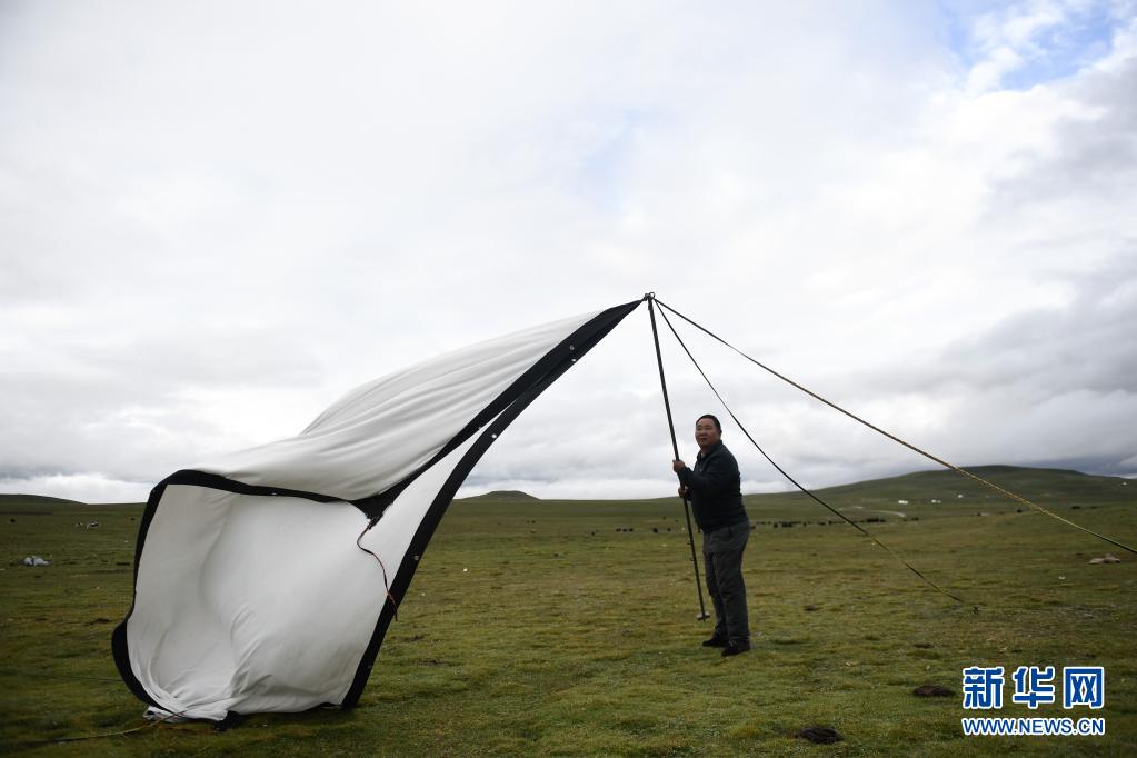 8月3日,在瑪沁縣當(dāng)洛鄉(xiāng)貢龍村的夏季草場(chǎng)上,南拉才讓在搭設(shè)電影幕布。新華社記者 李占軼 攝