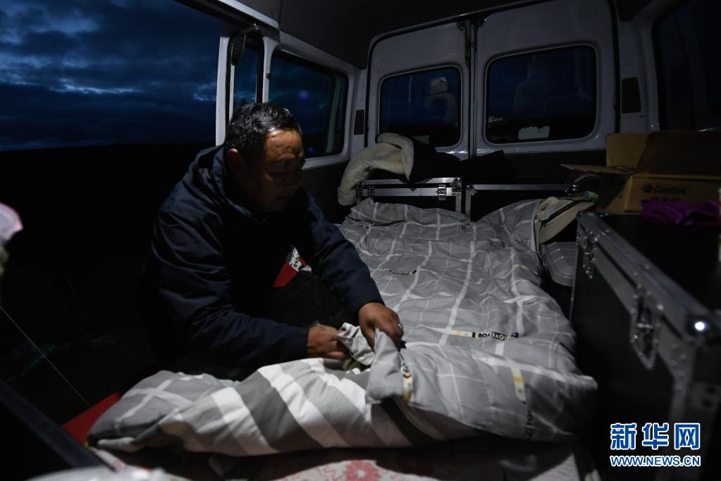 8月3日,在瑪沁縣當(dāng)洛鄉(xiāng)貢龍村的夏季草場(chǎng)上,南拉才讓在放映車(chē)中整理床鋪。每次到草原上放電影,南拉才讓都睡在車(chē)?yán)铩P氯A社記者 張龍 攝