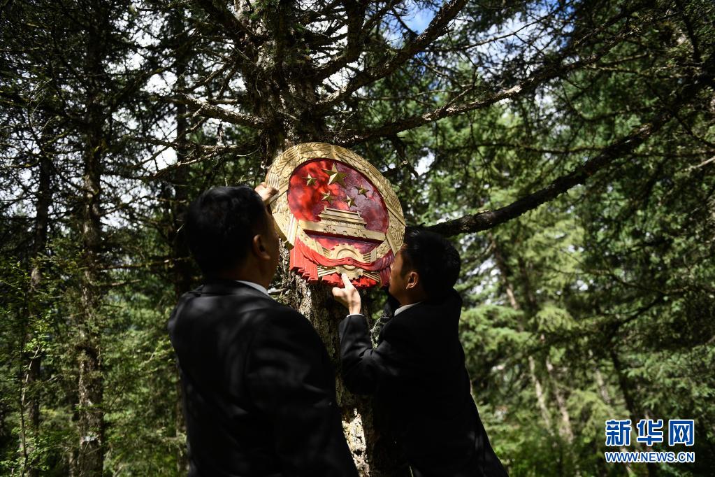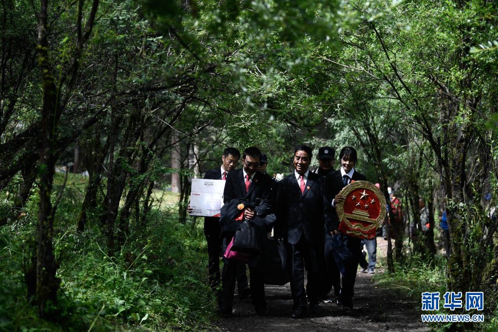8月7日,班瑪縣人民法院工作人員在林區(qū)懸掛國徽,布設巡回法庭。新華社記者 張龍 攝