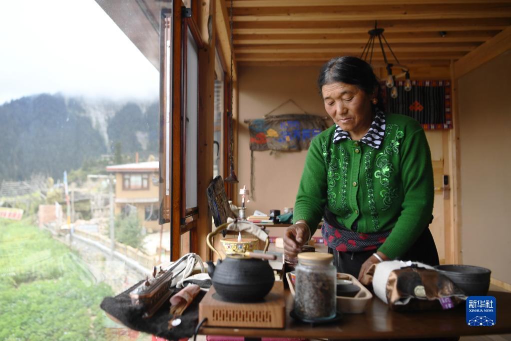 扎尕那村村民云草在自家的民宿里整理茶臺(tái)(8月28日)。新華社記者 陳斌 攝