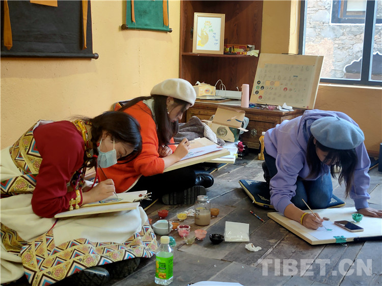 圖為游客體驗(yàn)藏族傳統(tǒng)美術(shù)工藝