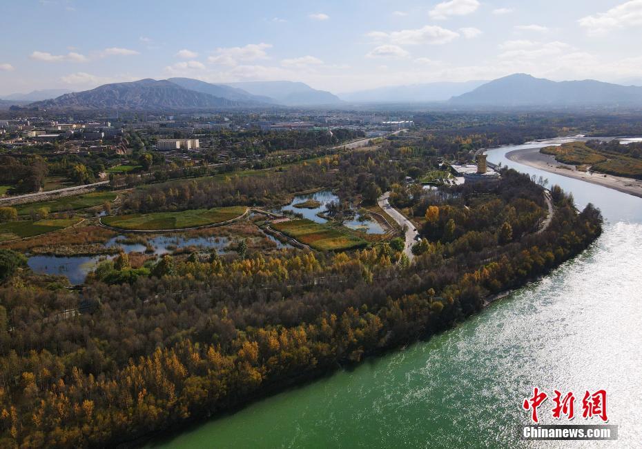 10月16日,航拍青海省海南藏族自治州貴德縣黃河岸邊的蘆花灣水生態(tài)公園。(無人機(jī)照片) 中新社記者 馬銘言 攝
