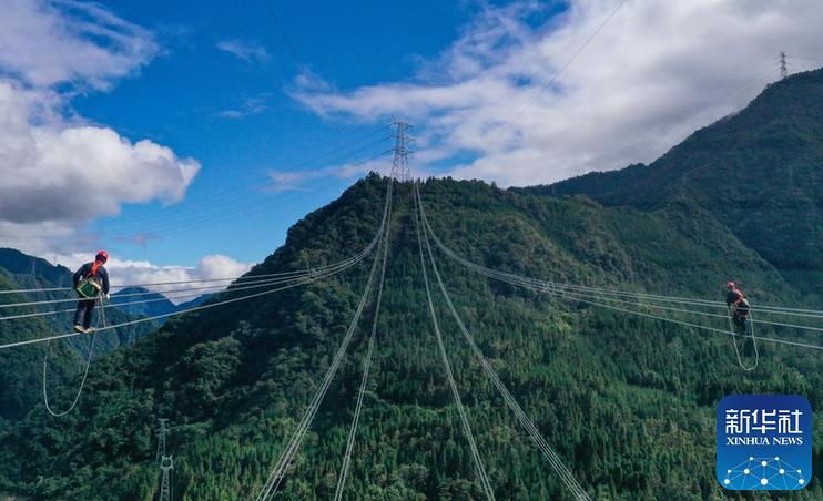 10月18日,在四川省雅安市天全縣喇叭河鎮(zhèn),技術(shù)人員在導線上進行質(zhì)檢工作(無人機照片)。新華社記者 王曦 攝