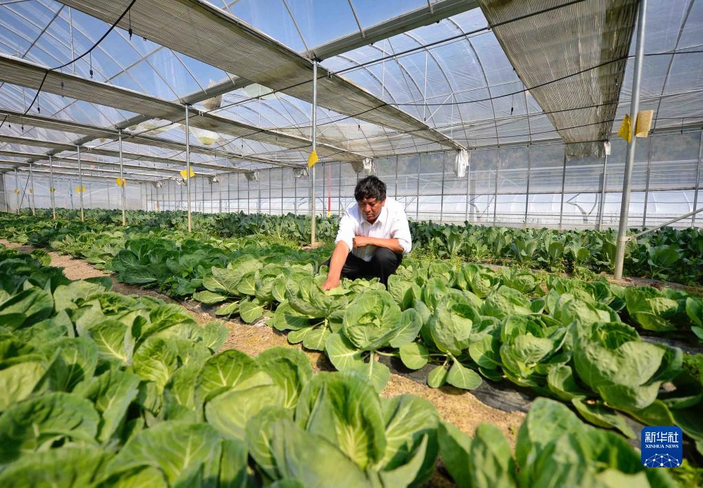 10月25日,村民在位于西地村的生態(tài)農(nóng)業(yè)示范基地內(nèi)查看蔬菜生長情況。新華社記者 劉坤 攝