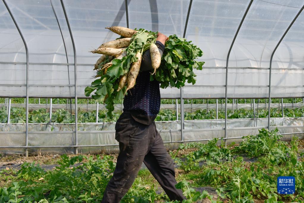 10月25日,村民在位于西地村的生態(tài)農(nóng)業(yè)示范基地內(nèi)搬運蘿卜。新華社記者 劉坤 攝