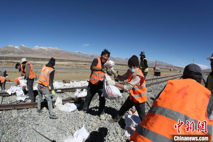 圖為工人在達瓊果站搬運新砟。中鐵十二局集團鐵路養(yǎng)護公司當雄車間供圖