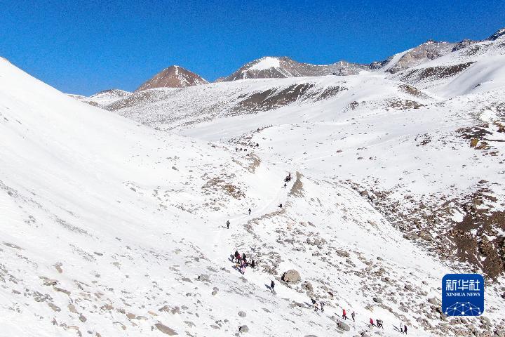 1月1日,登山愛好者攀登崗什卡雪峰(無人機(jī)照片)。新華社記者 王艷 攝