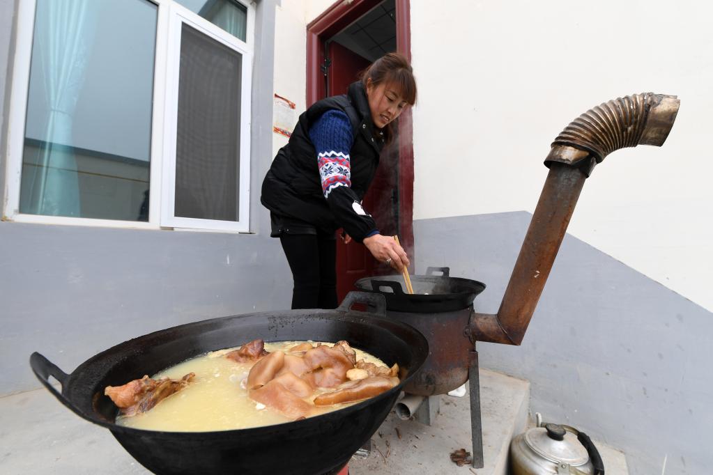1月25日,在蘭州新區(qū)舟曲避險(xiǎn)搬遷安置點(diǎn)家中小院,寧蘭玉炸油饃、煮臘肉。新華社記者 范培珅 攝