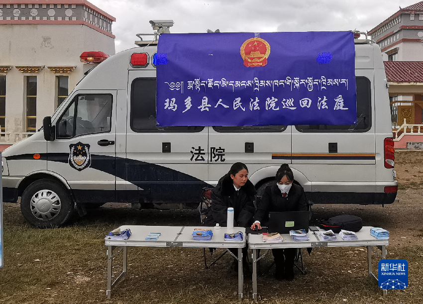 瑪多縣人民法院巡回法庭在瑪多縣扎陵湖鄉(xiāng)尕澤村開(kāi)展工作(2021年8月10日攝)。新華社發(fā)
